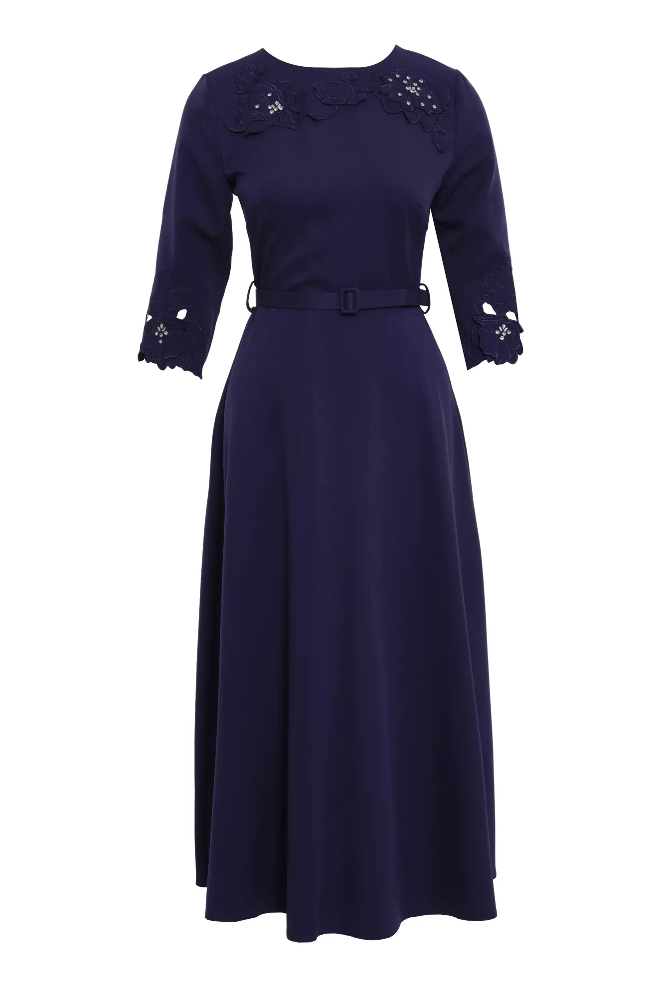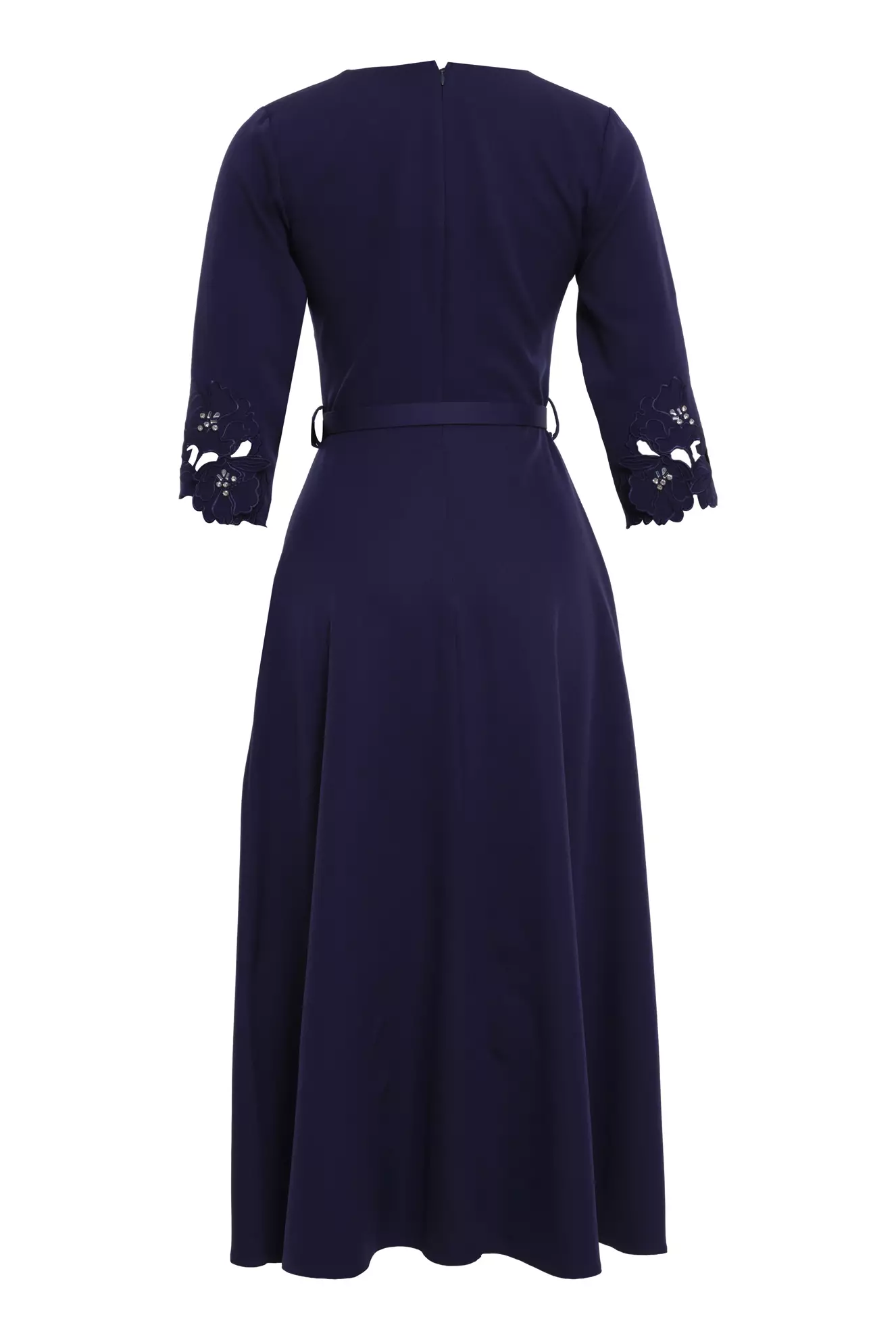 Navy Blue Crepe 3/4 Sleeve Midi Dress