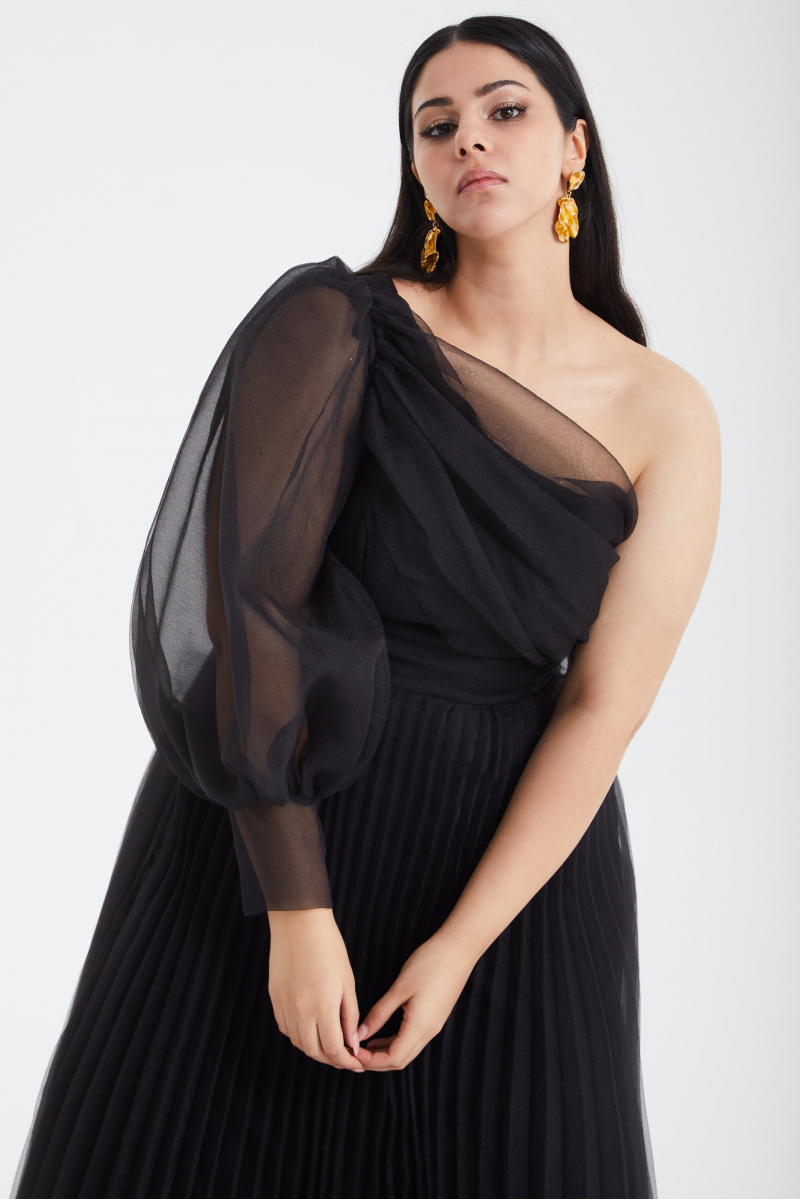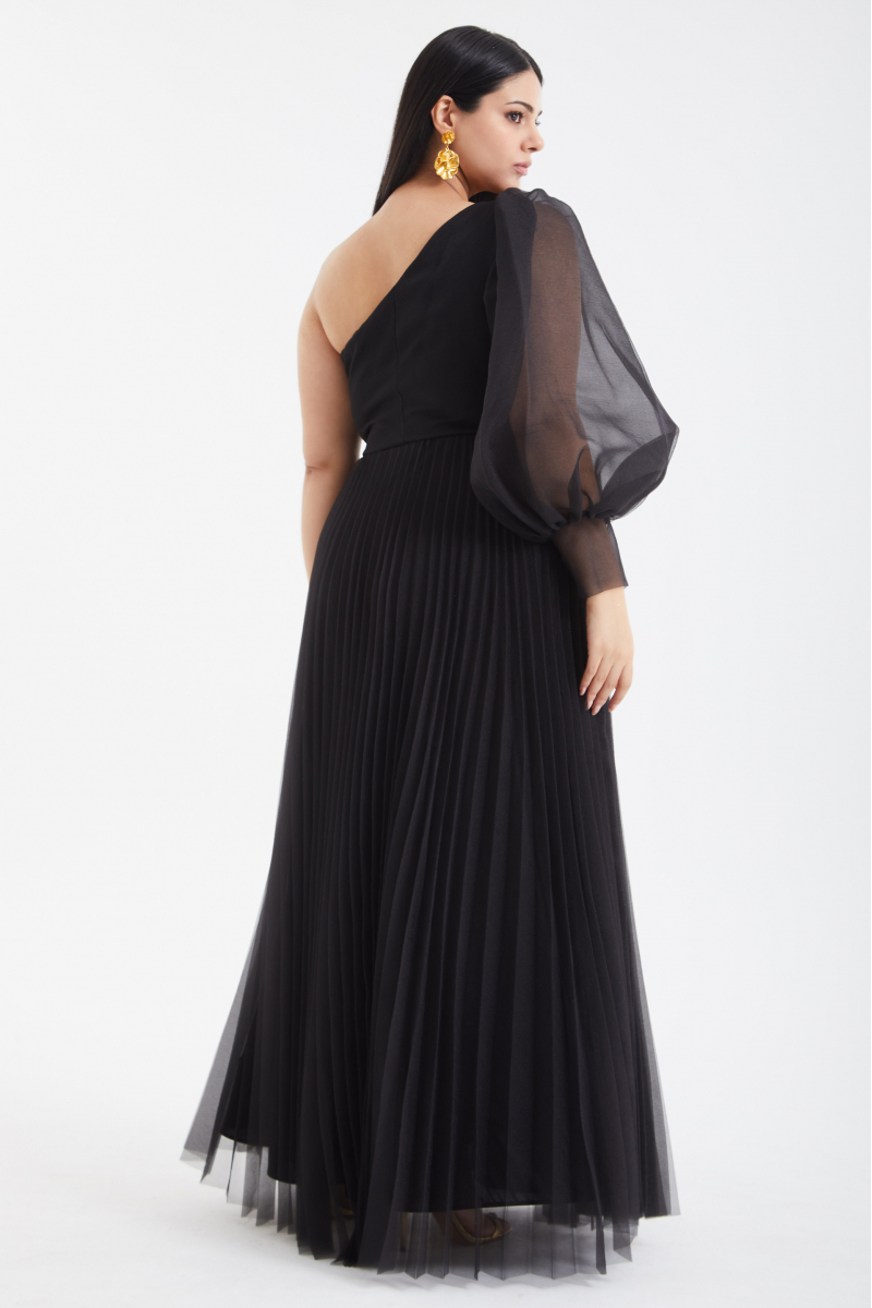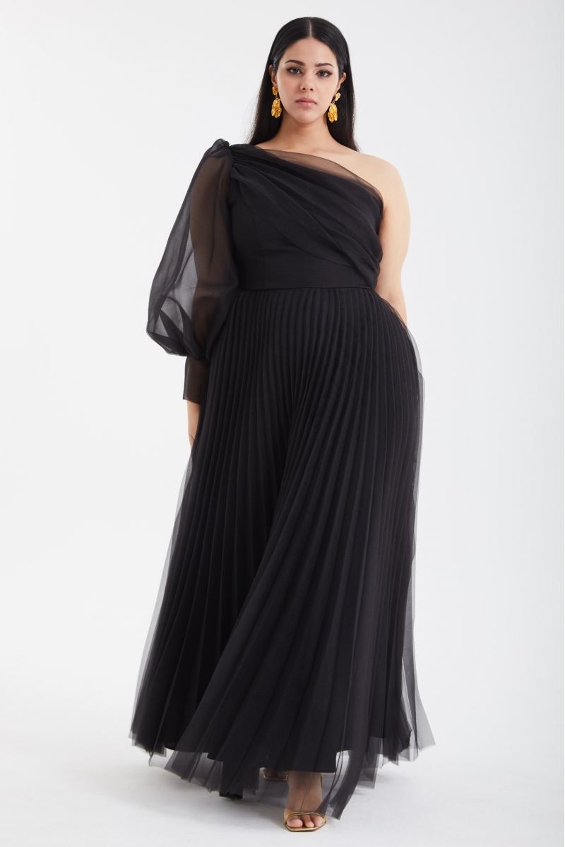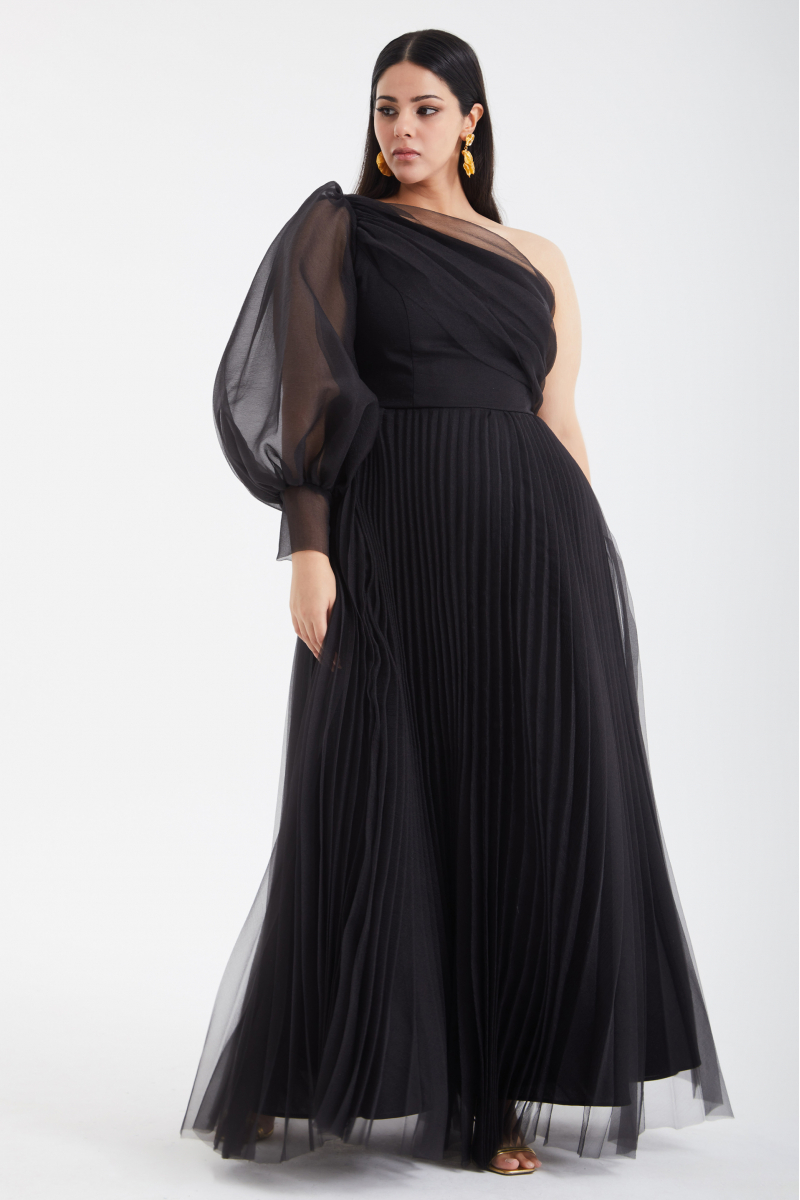 Black plus size tulle single sleeve long dress