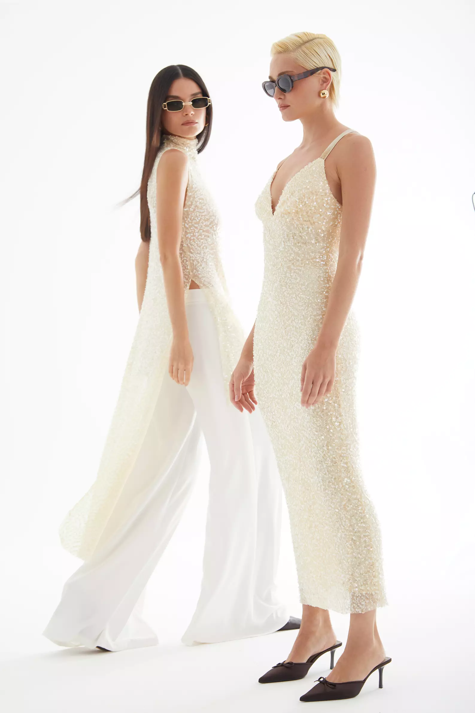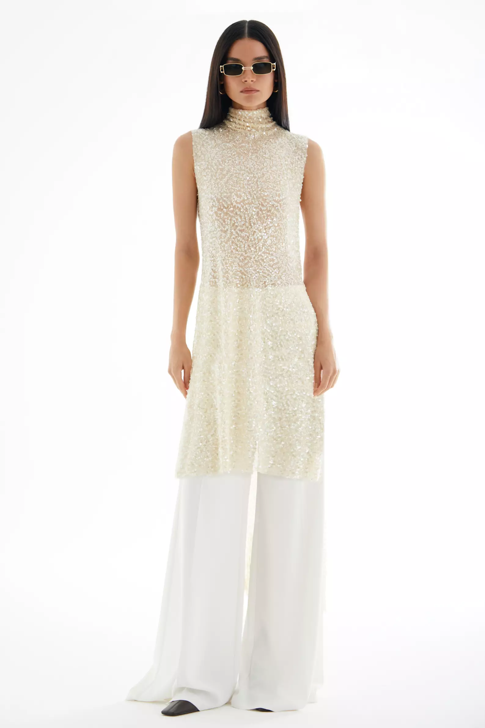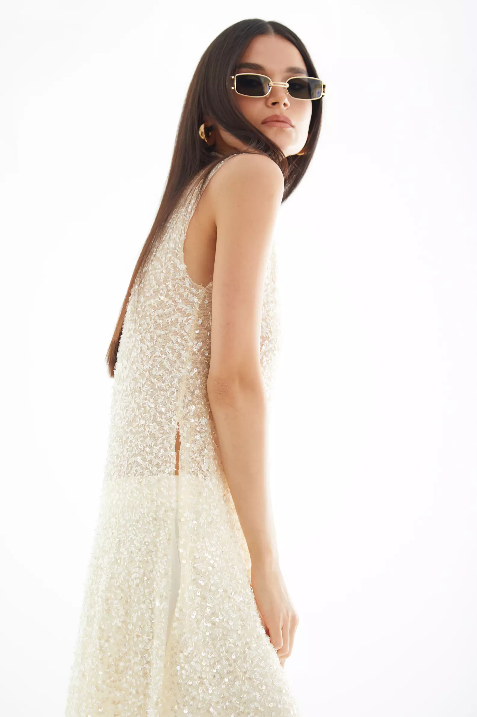 Beige Stamp Sequins Sleeveless Maxi Tunik
